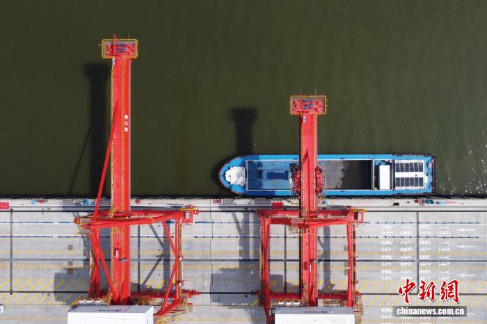 图为周心港重点港区范营功课区往还的货舟。(无人机相片)刘俏涛 摄