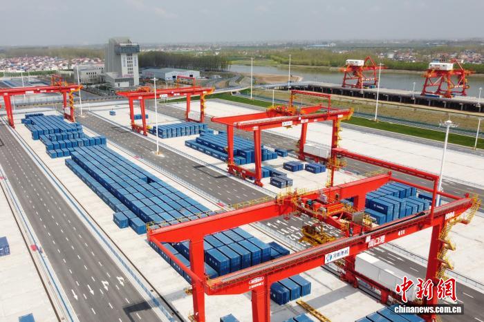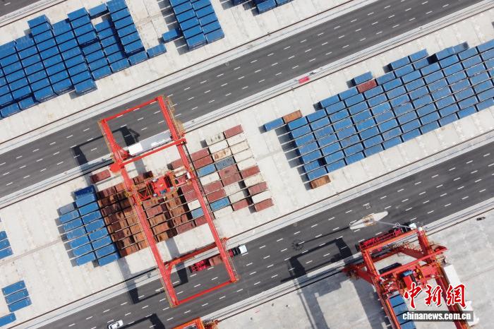 图为周心港重心港区焦点功课区正在吊拆货色上舟。(无人机相片) 刘俏涛 摄