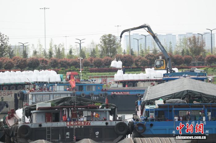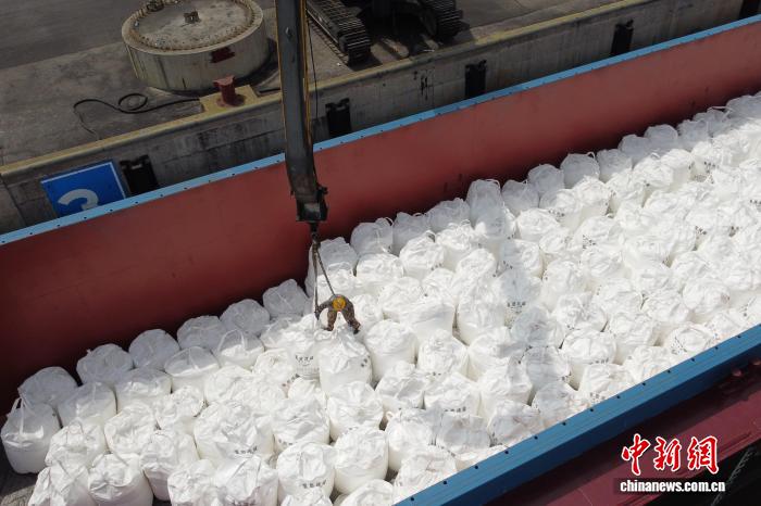 图为周心港中央港区范营功课区舟只正正在拆运杂碱。(无人机像片) 刘俏涛 摄